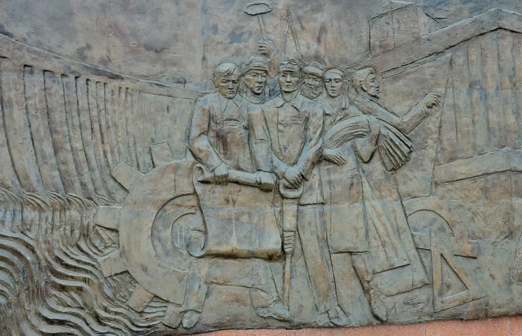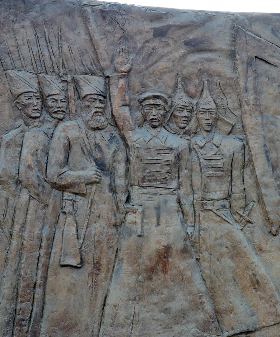 3. Утверждение советской власти в Казахстане. По косым полосам на папахах и будёновкам со звёздами видно, что этот период представляет красная, победившая сторона. Когда создавался этот комплекс, я не знаю, но возможно, что в позднем СССР или при раннем Назарбаеве.