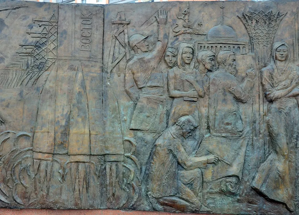 6. Строительство послевоенного советского Казахстана и взлетающая ракета «Восток», намёк на космодром Байконур.
