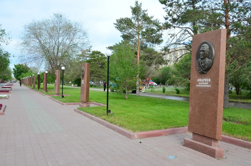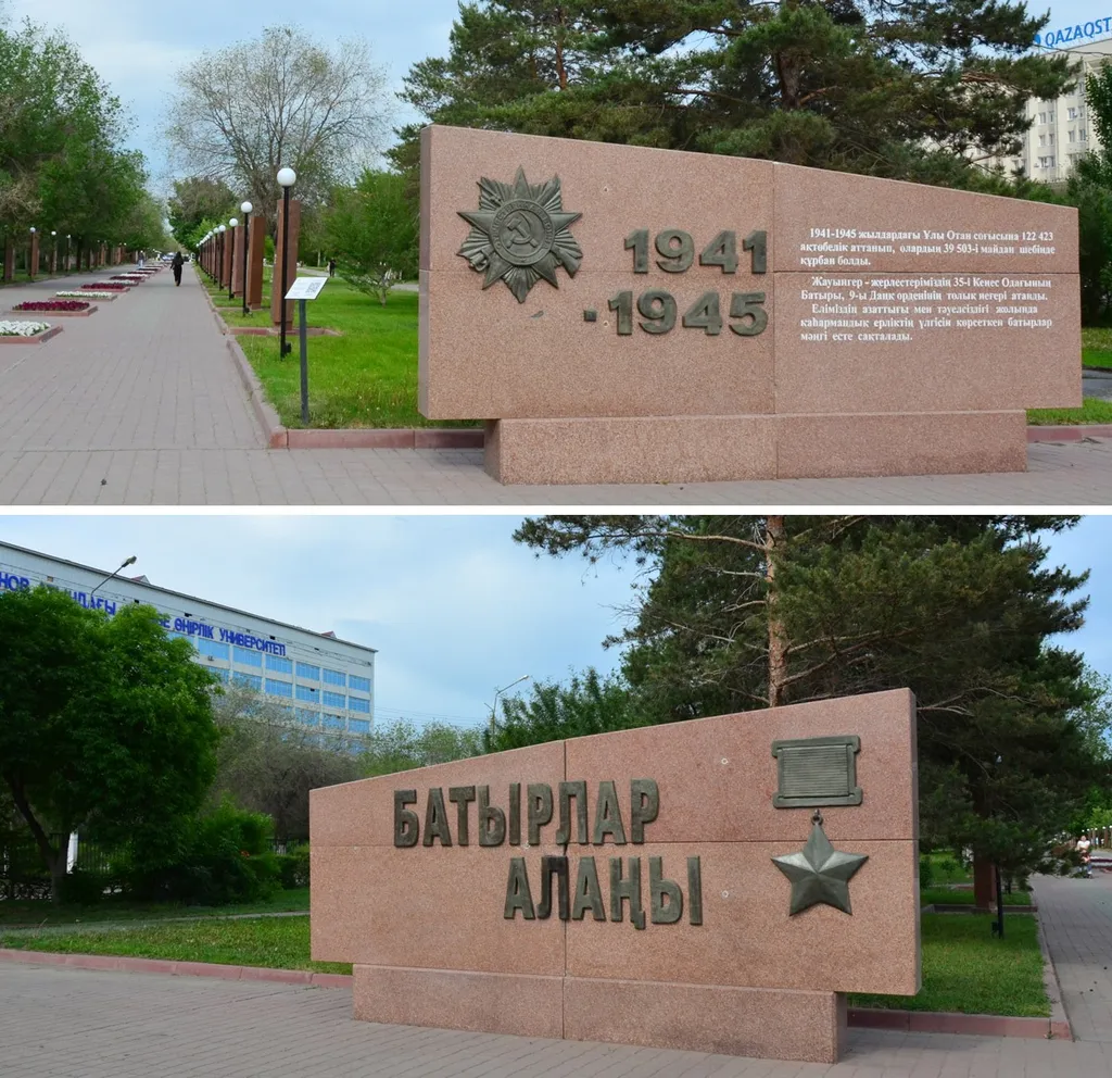 Так вот, сразу за территорией Актюбинского лётного училища идёт довольно протяжённая военно-мемориальная зона, где проспект превращается в более широкую полосу с вытянутым сквером вдоль него.