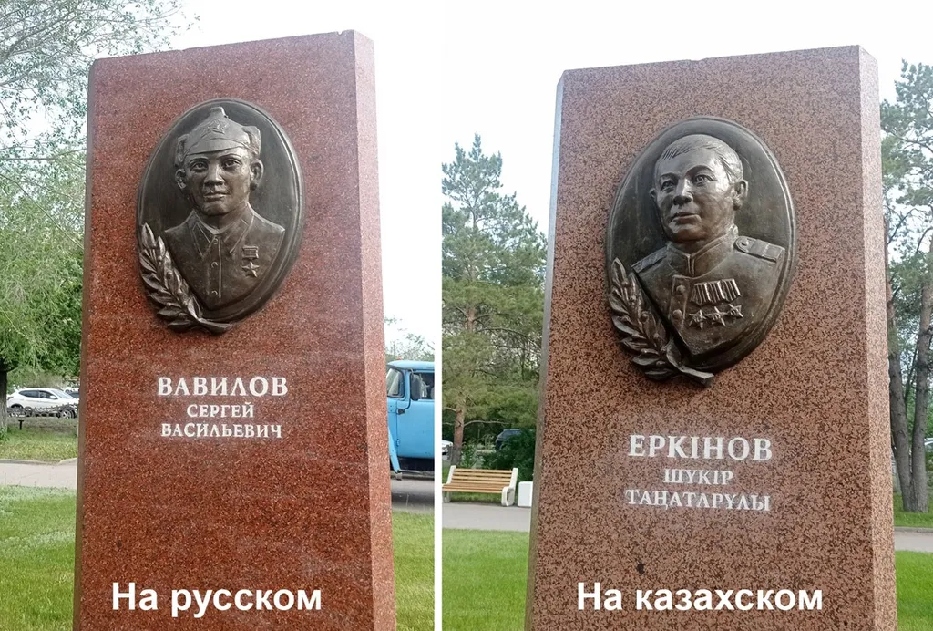 9. При этом заметил интересный момент. На русском написаны имена и фамилии русскоязычных героев, а на казахском — этнических казахов. При этом казахские надписи выполнены кириллицей.