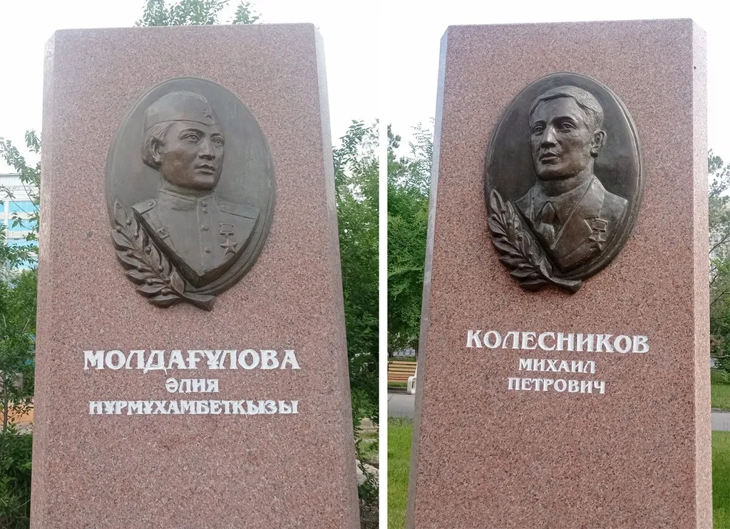 Центральный проспект в западной части Актобе носит имя Алии Молдагуловой. Это 18-летняя девушка-снайпер 2-го Прибалтийского фронта, уроженка этой области. Жила с 1939 в Ленинграде у своего дяди, который учился в Транспортной академии, и прожила там первые блокадные полгода. Потом ее эвакуировали в тыл, где она в 1943 отучилась в школе снайперов. Итог: 78 немцев на счету. Герой Советского Союза посмертно (1944). Погибла под Новосокольниками во время боя. Интересная биография, хотя и короткая.