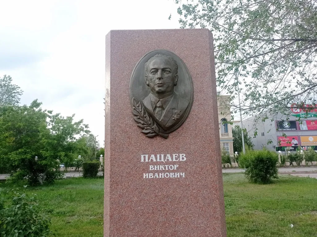 11. В самом конце Аллеи Героев обнаружился Виктор Пацаев, отдельно никак не выделенный. Но он уже не герой войны, а герой космоса, погибший в 1971 г. Однако выполнен в том же стиле, что и военные герои. Потом я уже посмотрел, что он родился в Актюбинске.