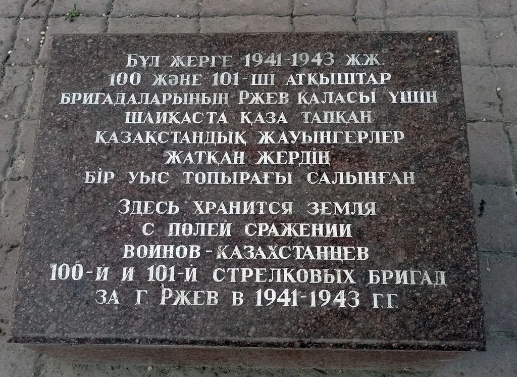 12. На завершении Аллеи Героев на земле — мраморная плита с надписью на двух языках. «Здесь хранится земля с полей сражений воинов-казахстанцев 100 и 101 стрелковых бригад за город Ржев в 1941–1943 гг.». То есть мы видим национализацию памяти о войне, но без изменения её политической сущности. Здесь не пытаются переделать войну в русско-немецкую или изменить датировку на 1939–1945 гг.