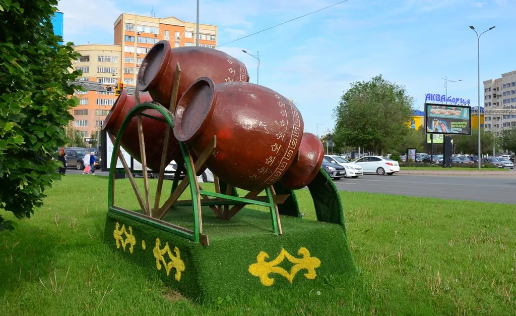 14. На перекрёстке проспекта Молдагуловой и Абилкар-хана мемориальная зона кончается и сбоку начинается современный микрорайон, а в качестве малых скульптурных форм установлены национальные этнические символы. Вот, например, какие-то горшки, из которых изливается что-то зелёное.