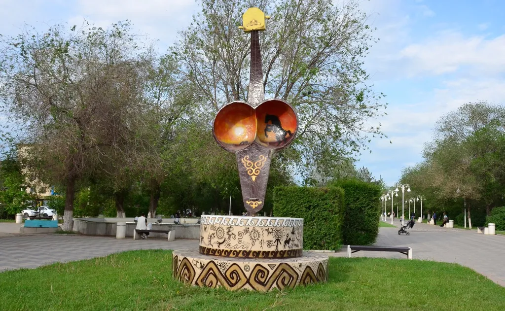 16. Идём дальше. Мемориальная зона превратилась в прогулочную. Как мне показалось, вот тут какой-то чисто казахский музыкальный инструмент. Не знаю, что это такое.