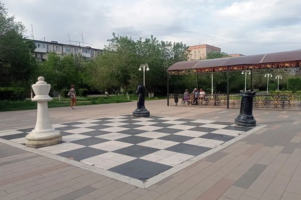 17. Дальше вдоль старых советских 5- и 9-этажек — широкий сквер для отдыха. Гигантские шахматы, зона для доминошников и прочее такое.