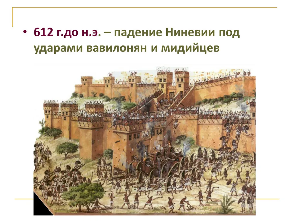 · В 612-м году до нашей эры войска этой странной коалиции после страшной трехмесячной осады буквально стерли с лица земли Ассирийскую столицу Ниневию. Народ, что еще вчера заставлял трепетать в страхе полмира, сегодня сам оказался в придорожной пыли…