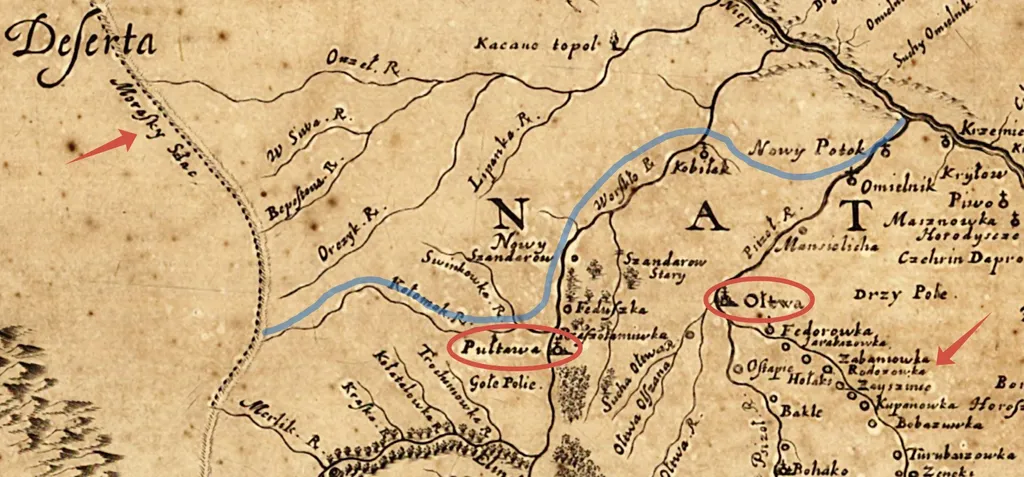 Южнее Полтавы и Олтвы (не забываем, на польских картах Боплана северное направление внизу) хорошо просматривается линия северной границы Дикого поля на левобережье Днепра. Её можно провести по рекам Коломак, Ворскла, Кобелячка и Псел (синяя линия). Стрелки указывают на Муравский шлях и вереницу поселений на левом (северном) берегу реки Хорол, которая резко обрывается после пограничной Олтвы. Дальше начинается Дикое поле. Поселение Кобеляк (сейчас Кобеляки) возле которого условная граница Дикого поля круто поворачивает на север в сторону Псла, такой же как Полтава и Олтва форт.