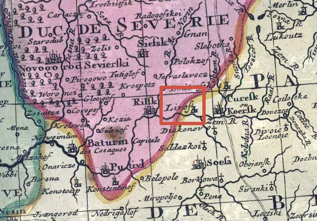 Это фрагмент довольно поздней карты, изданной в 1730 году потомственными голландскими картографами братьями Ренье и Джошуа Оттенс. На карте Крум и Арул уже обозначены, как Кромы (Kromi) и Орел (Orel). А вот построенный на Сейме в первой половине 17 века между Рыльском и Курском форт обозначен как Львов (сегодня город Льгов). Из Ипатьевской летописи известно о существовании на месте Льгова древнерусского города Ольгов, разрушенного половцами в 12 веке. И все было хорошо да тихо, пока в дверь не постучала гиперинформация.