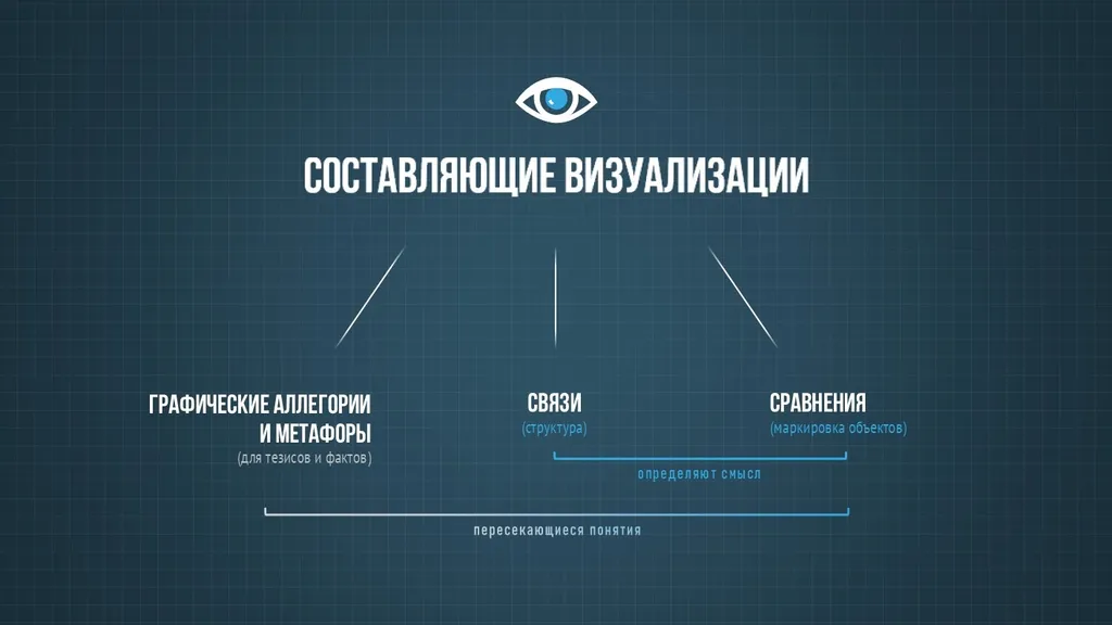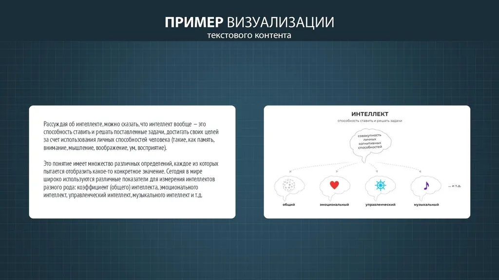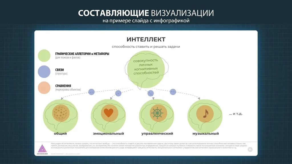 Визуализация отдельных тезисов и фактов является первым шагом уже непосредственно в отрисовке инфографики. Основные инструменты — графические образы, репрезентирующие факты на инфографической схеме с акцентом на аллегории и метафоры для передачи тех или иных смысловых нюансов. Аллегория выражает абстрактные идеи через конкретные символы, а метафора опирается на переносное значение, основанное на общих признаках или культурных стереотипах. Например, при визуализации определения интеллекта как «способности решать задачи с опорой на когнитивные функции (память, внимание, мышление)» центральным образом может стать мозг (или его условное обозначение в виде иконки) — универсальная метафора разума. Такой приём обеспечивает мгновенную ассоциацию и экономит место на слайде. Если подходящий образ подобрать сложно — следует оставить текст, сокращённый до тезисов (для лаконичности).