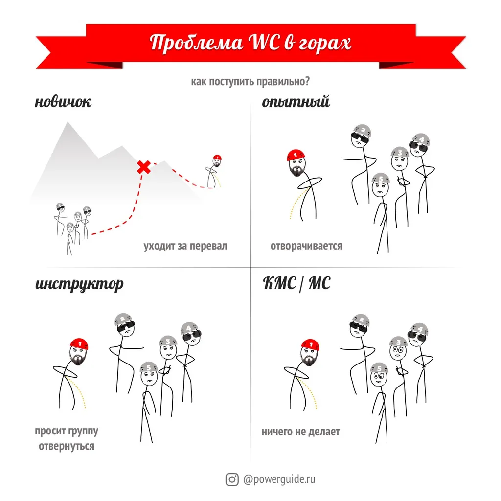 При необходимости справить малую нужду новичок уходит за перевал; опытный альпинист становится спиной к группе; инструктор просит отвернуться группу, а мастер спорта даже этого не делает]
