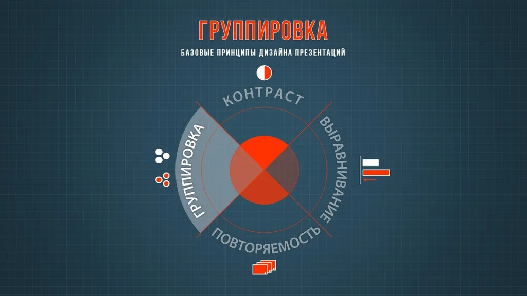 Принцип группировки основан на идее, что расположенные рядом элементы воспринимаются как связанные. Группировка решает две задачи. Первая — структурирование: контент организуется (группируется) в логические блоки, упрощающие его осмысление. Вторая —управление вниманием: группировка направляет взгляд зрителя по слайду в нужной последовательности, поддерживая повествование.