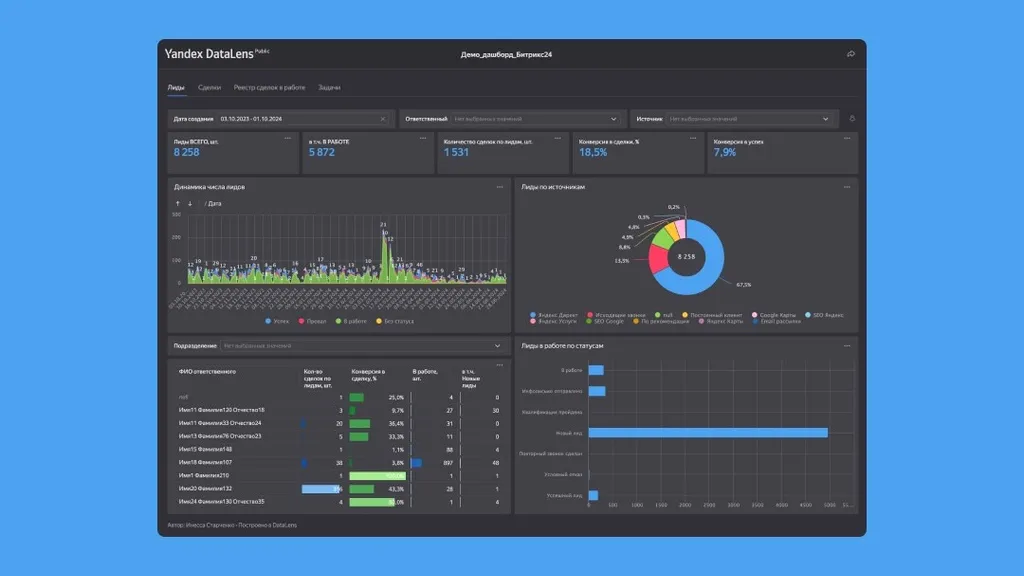 Сейчас отчет развернут на демо БД, но он и называется шаблоном, потому что его можно развернуть на других аналогичных выгрузках. Для этого вам понадобится выгрузка из Битрикс24, которую можно получить бесплатно, используя триал mybi connect. После этого напишите в мой Telegram (@Inna_V_Starchenko) сообщение с текстом «Шаблон mybi», и я свяжусь с вами, чтобы передать и помочь настроить шаблон на ваших данных Битрикс24. Пока мы не добавляли этот шаблон в маркетплейс Datalens и процедуру нового подключения необходимо производить вручную. Если вам потребуется решение более сложных задач, мы также можем предложить создать отчеты, полностью адаптированные под ваши индивидуальные потребности и специфику работы в Битрикс24.