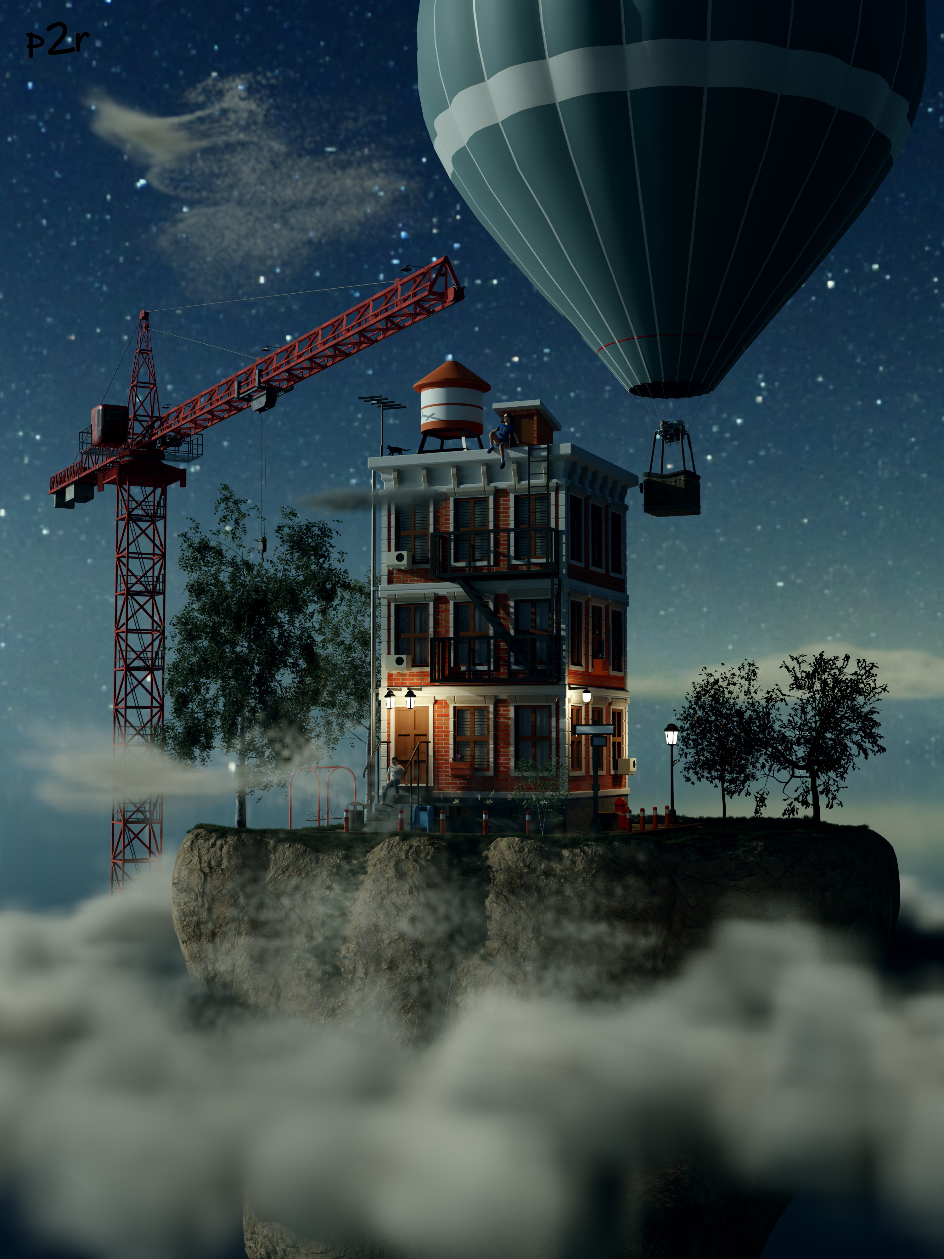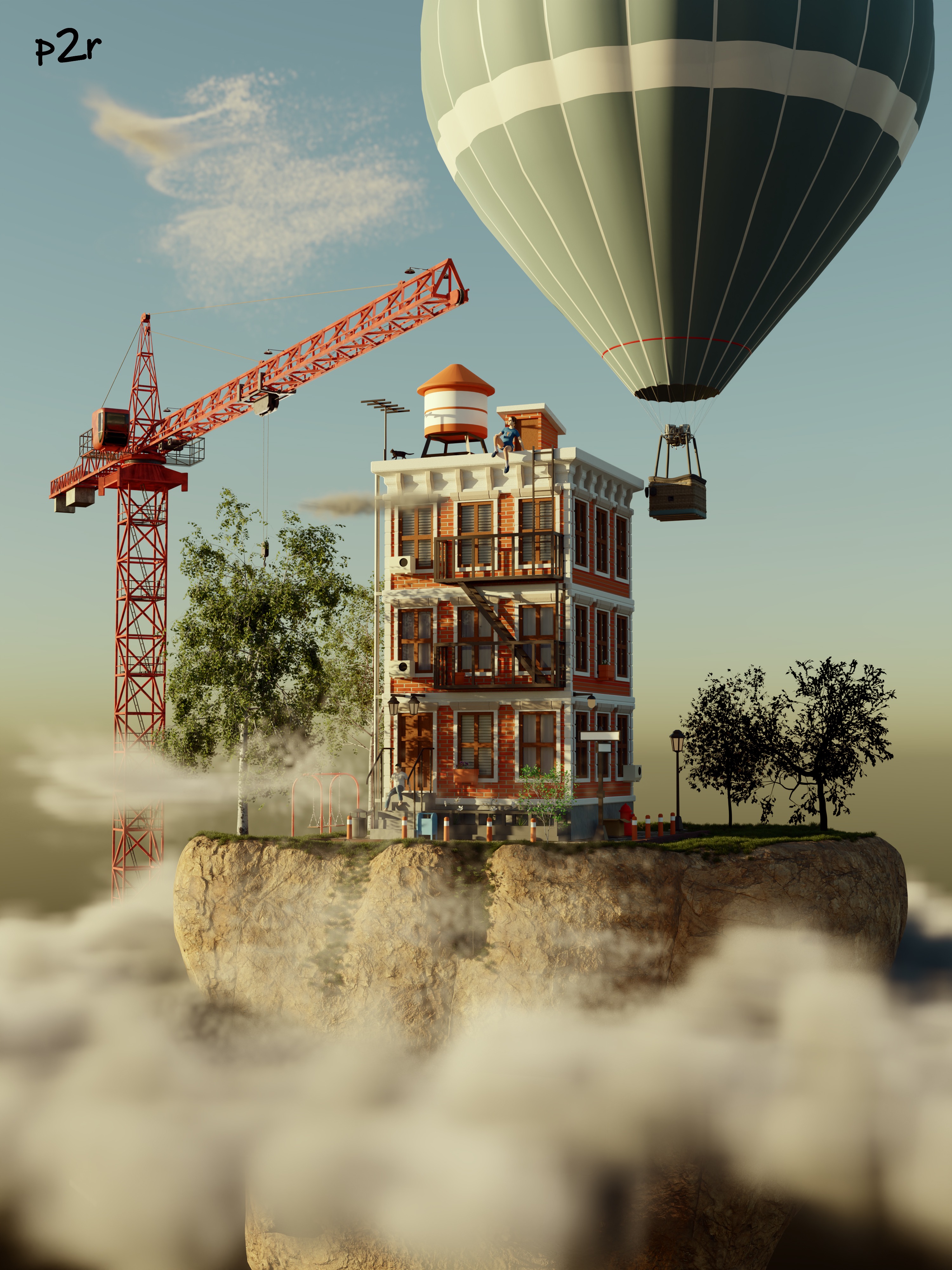 «Жизнь в облаках» — это художественное исследование на тему синтеза реальности и вымысла. Работа создавалась для профильного конкурса, но вышла далеко за его рамки, став примером филигранной работы со светом, фактурами и композицией. Главная цель авторов — показать, как привычные элементы городской застройки (кирпичная кладка, строительный кран) могут органично существовать в сюрреалистичном окружении.