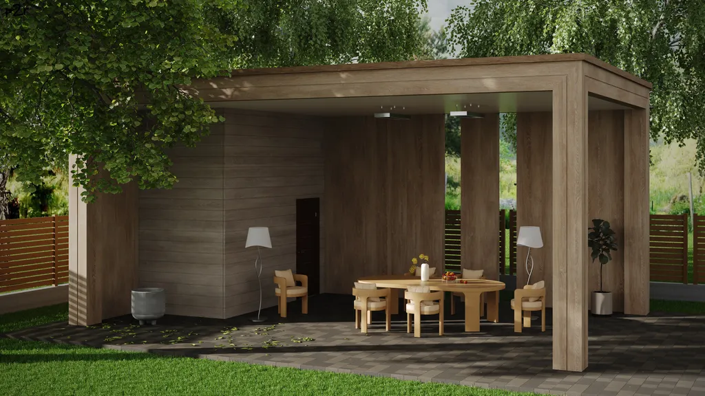 Особое внимание уделено естественному дневному освещению. Система включает мягкие тени от листвы, динамичную игру света и тени на деревянных поверхностях, реалистичное затенение пространства под навесом. Результат — эффект присутствия и настроение спокойного летнего полудня.