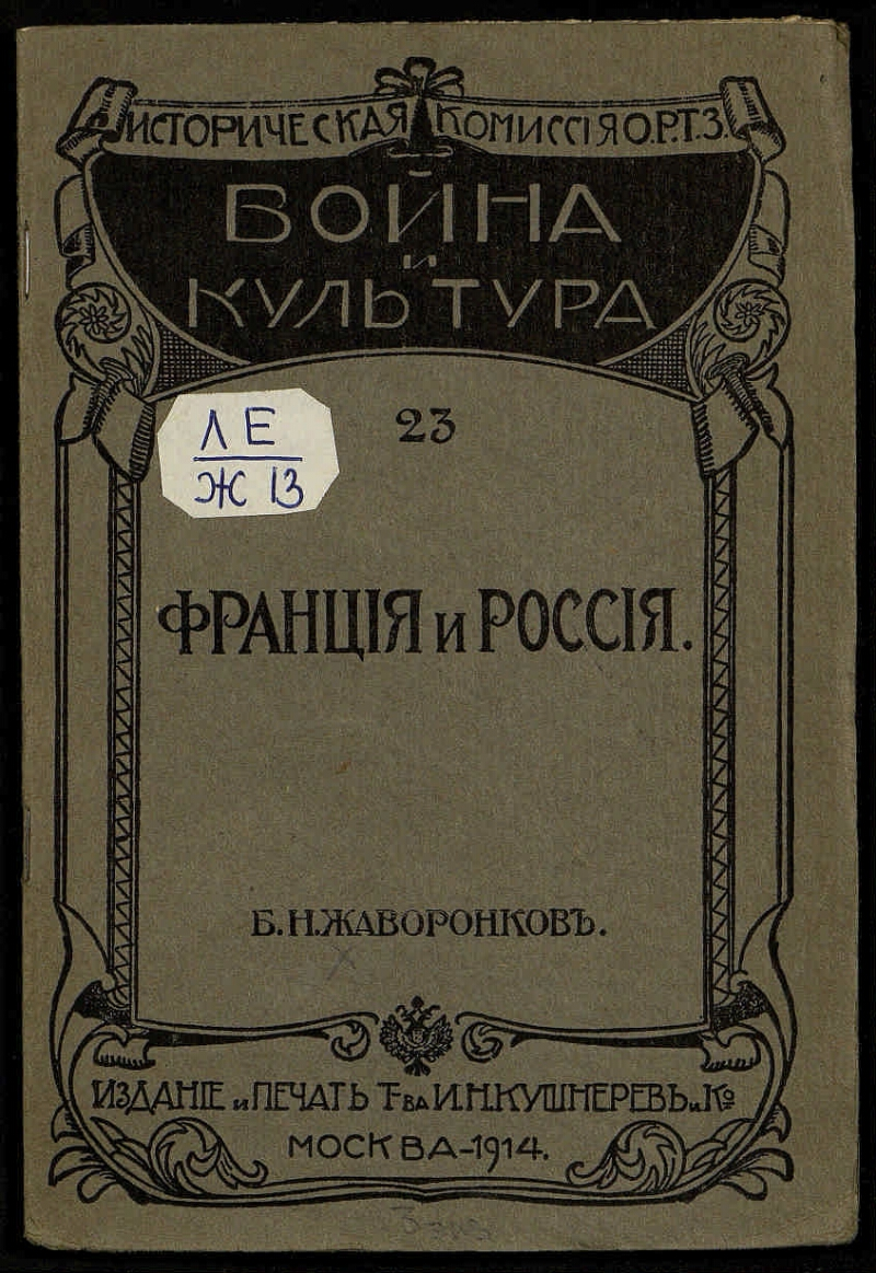 Франция и Россия / Б. Н. Жаворонков; Ист. комис. О.Р.Т.З. — Москва: т-во И. Н. Кушнерев и К°, 1914.