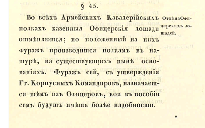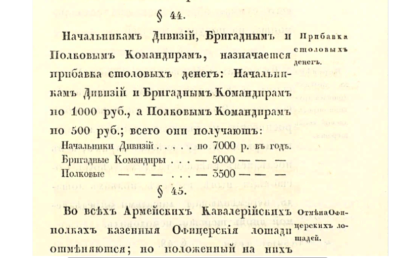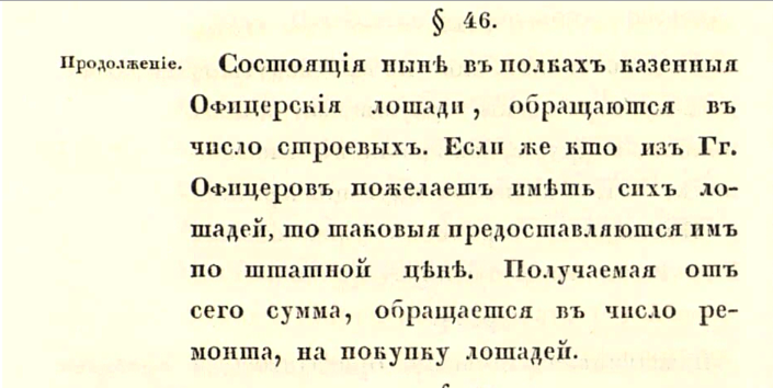 В соответствие с исконно русскими традициями начальству повышалось денежное содержание, а офицерские «казенные» лошади упразднялись, теперь господа офицеры должны были лошадок приобретать за свой счет. Весьма своеобразная экономия бюджета, особенно с учетом сумасшедшей чехарды мундиров (см. ниже).