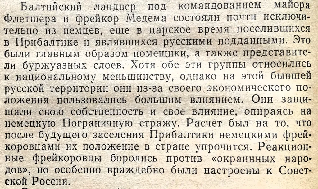 Книга писалась и издавалась в советское время с соответствующими коррективами, но все изложенные факты подтверждаются другими источниками. В частности немецкие аналитические справки второй половины 30-х годов, которые мы в свое время публиковали на старом канале, подтверждают, что немецкое национальное меньшинство имело в Латвии, Литве и Эстонии свои организации, газеты и журналы на немецком языке, а главное, занимало ряд ключевых позиций в экономике и владело существенными активами. Действия немецкого фрайкора в Латвии временно носили характер выполнения заказа правительства Ульманиса на противостояние войскам Красной Армии, но на самом деле расчет тут был на упрочнение немецкого влияния на будущее, ведь германский империализм все еще не желал признавать свое окончательное поражение и надеялся хотя бы на Востоке сохранить некоторые позиции.