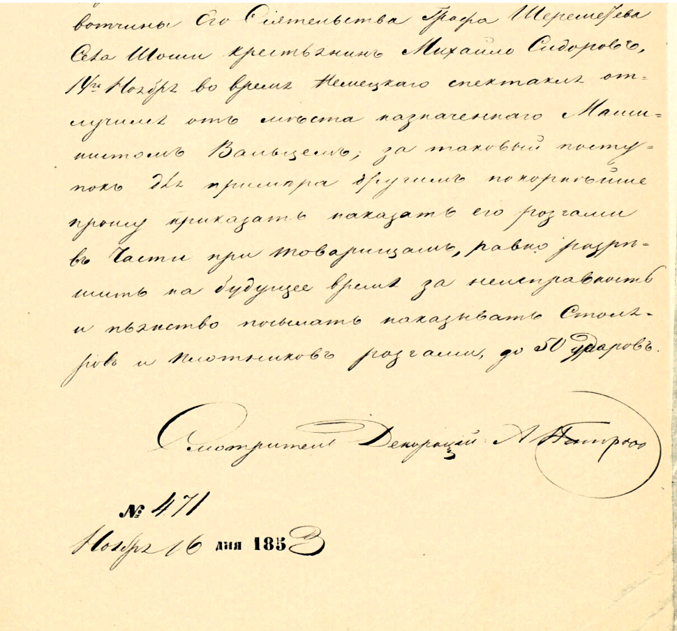 «Вольнонаемный плотник при Театре Цирк Московской губернии Клинского уезда Его Сиятельства Графа Шереметьева села Шоши крестьянин Михайло Сидоров 14-го ноября во время немецкого спектакля отлучился от места назначенного машинистом Вальцем, за таковой поступок для примера другим покорнейше прошу наказать его розгами в части при товарищах, равно разрешить на будущее за неисправность посылать наказывать столяров и плотников розгами до 50 ударов».