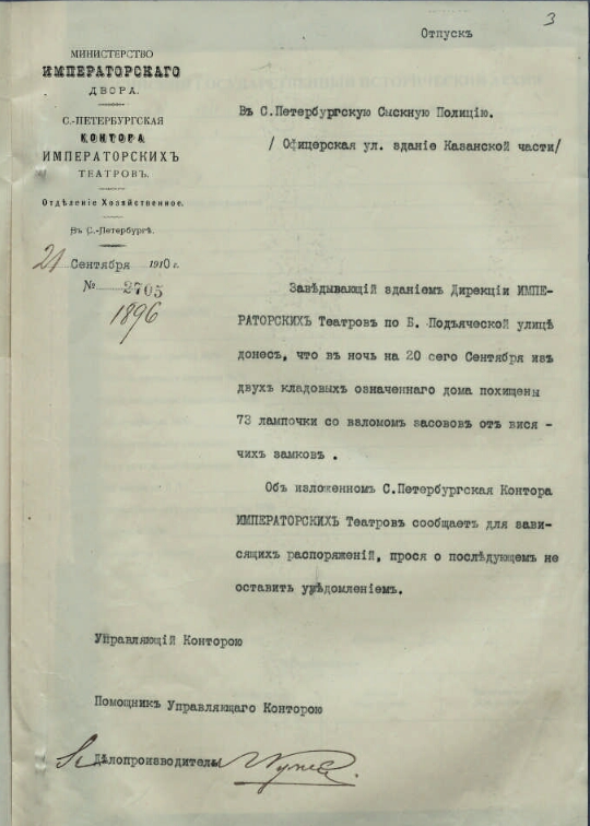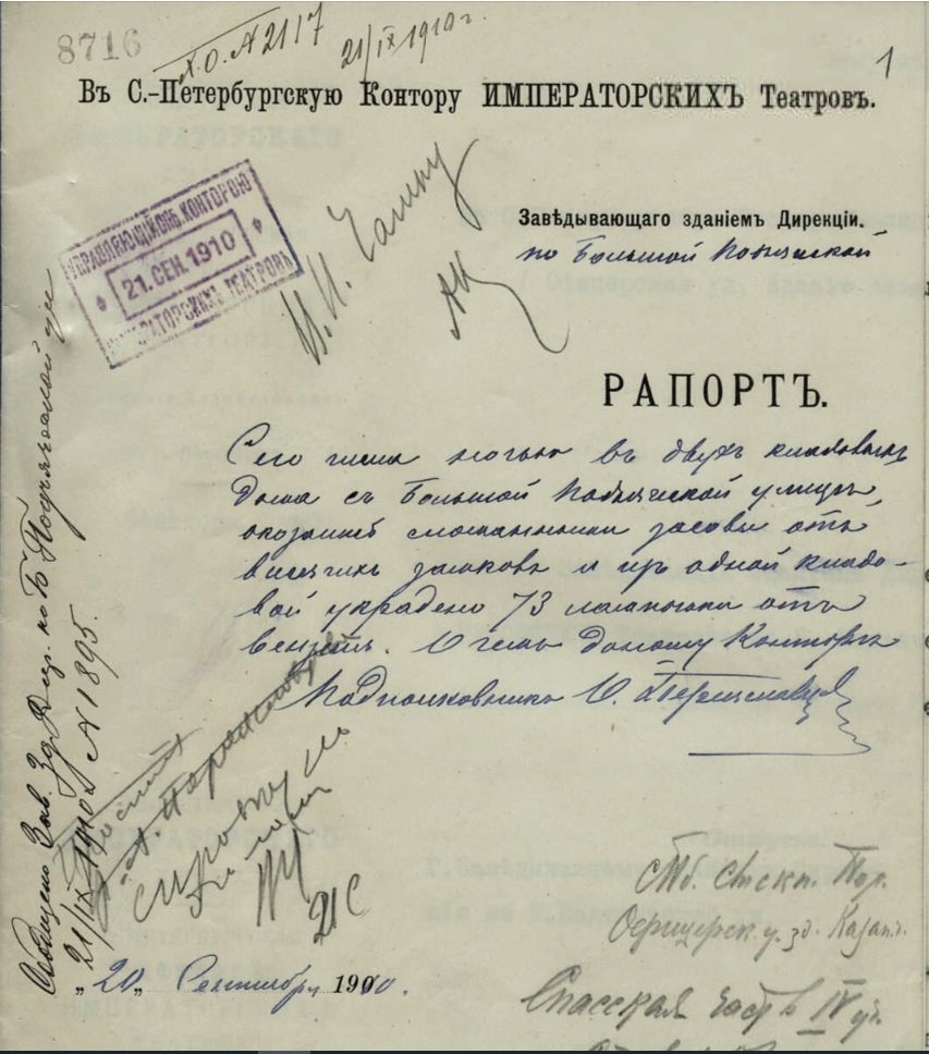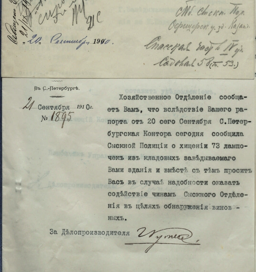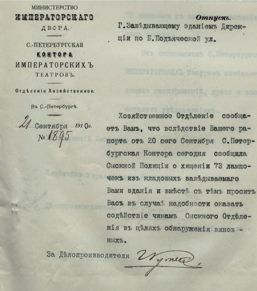 Ну, и обещанный бонус. Мы же про театры, про прекрасное, а не про какие-то там розги, от которых страдает ранимая душа российского просвещенного помещика. То самое дело о таинственной пропаже лампочек из кладовой. Это уже ХХ век. Золотое время, года Империя шла к своему пику благополучия, одолев проклятущих смутьянов, но проиграв войну японцам. Читая такие дела, многое понимаешь: вот она, суть бюрократии. Украли лампочки — доложи по команде. Там осмыслят и решат, что надо, пожалуй, обратиться в полицию, раз так. И напишут в ответ, мол, ждите и оказывайте содействие. Бумаги туда-сюда носят курьеры, их регистрируют и подшивают. По такому относительно несложному эпизоду вся переписка уложилась в один день, ну, потом в полиции еще денек промариновали бумаги, глядишь, через недельку после кражи пришел полицейский чин…