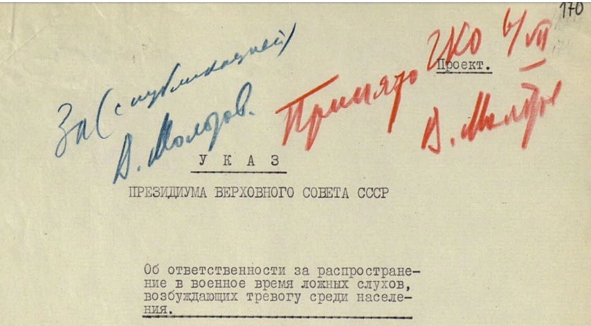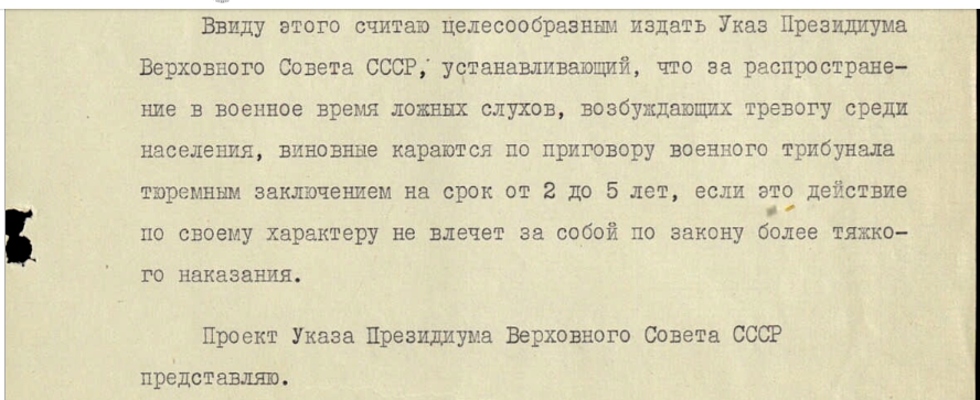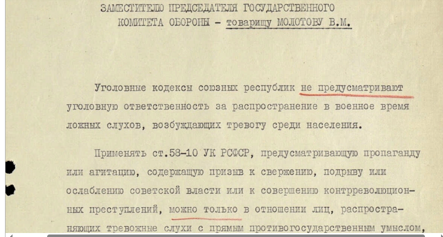 Но самым важным документом тут является, безусловно, записка Вышинского. В ней объясняется необходимость такого Указа. На тот момент по ст. 58.10 можно было осудить только при наличии признаков контрреволюционной деятельности и умысла против государства. А просто болтовню подводить под 58.10 посчитали нарушением закона. Но болтовня тоже была опасной и ее требовалось пресекать.