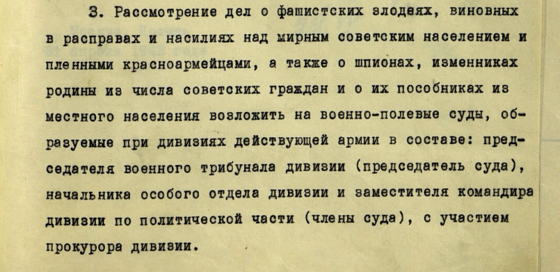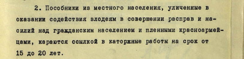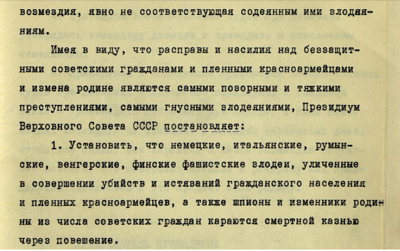 Указ Президиума Верховного совета СССР «О мерах наказания для немецко-фашистских злодеев, виновных в убийствах и истязаниях советского гражданского населения и пленных красноармейцев, для шпионов, изменников Родины из числа советских граждан и для их пособников» от 19 апреля 1943 г.