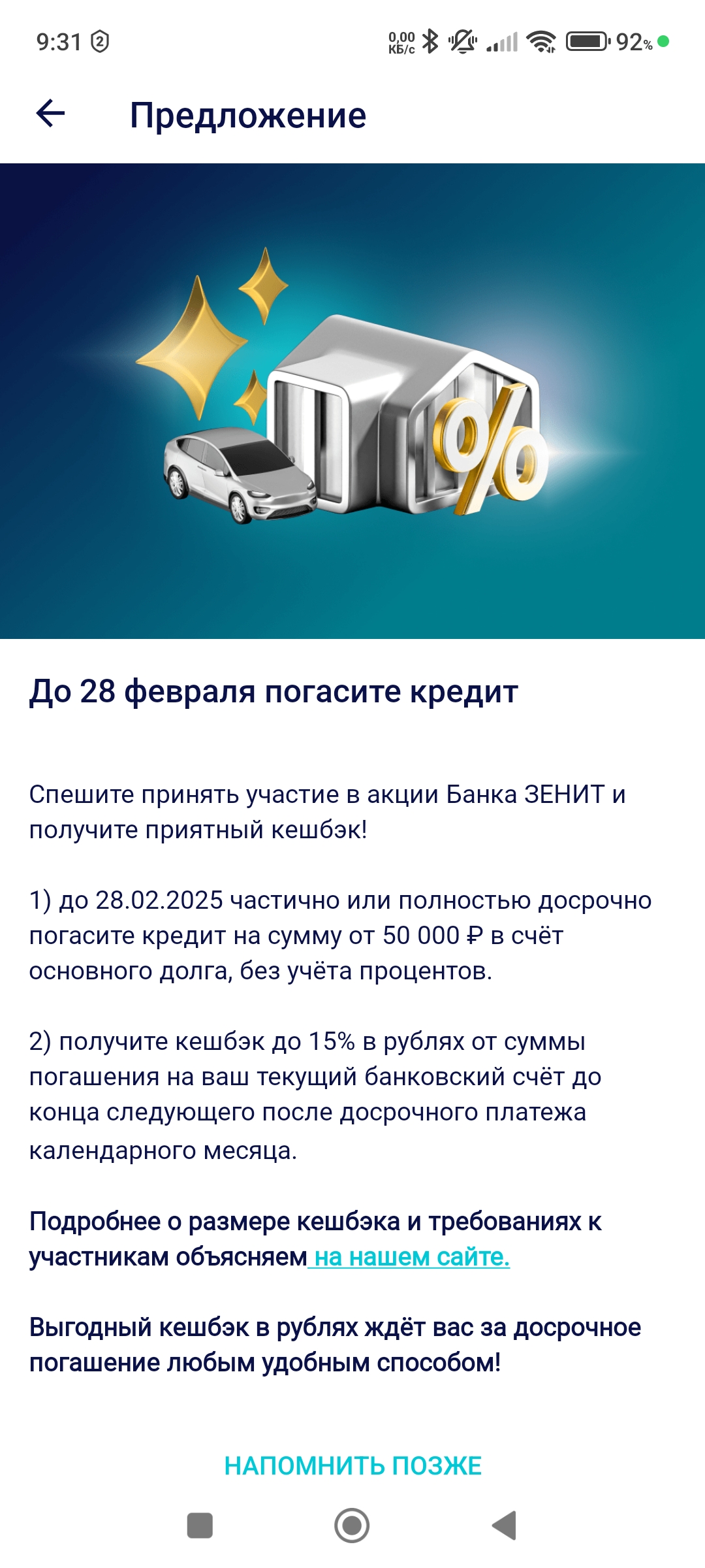 Банк Зенит, предлагает своим заёмщикам, Кешбек в размере 15℅ за досрочное погашение кредита от 50 тыс. рублей, до 28 февраля 2025 года.