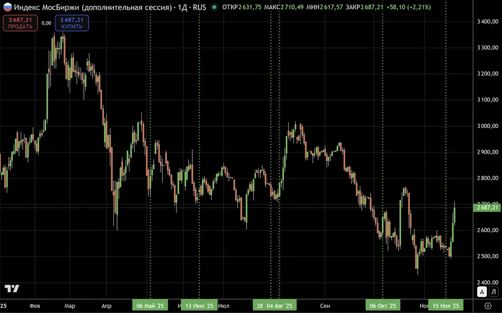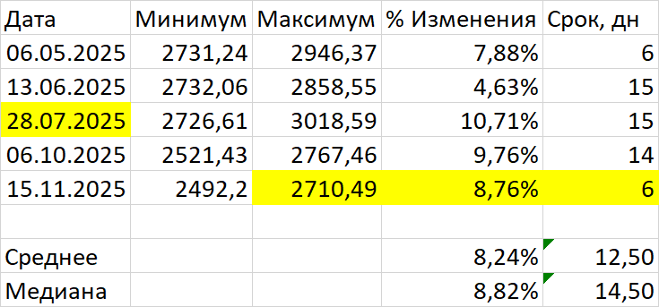 Импульс роста индекса МосБиржи составлял в среднем 8,24%, медиана роста 8,82%. Максимальный рост составлял 10,71%.