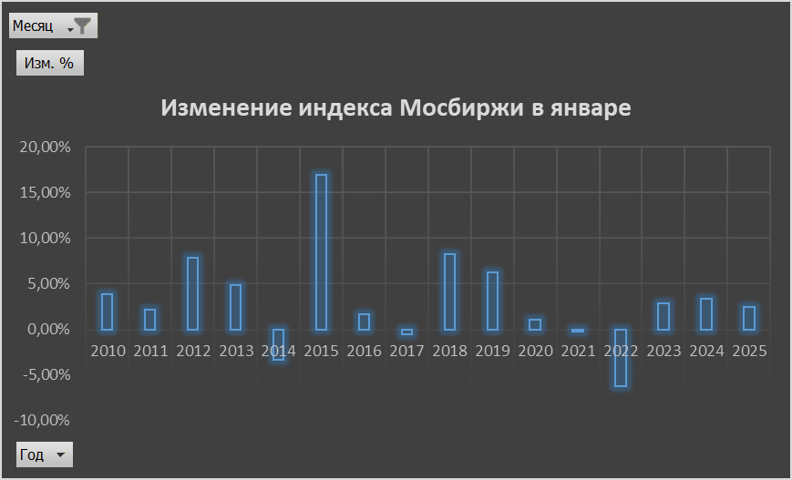 Вернемся к изучению и обновлению статистики по месяцам для индекса МосБиржи. Многие уже отметили, что январь является самым сильным с точки зрения среднего изменения.