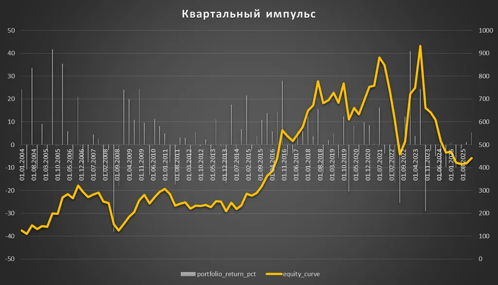 По квартальному импульсу общий итог портфеля был бы примерно такой же как в годовом, с учетом стандартного отклонения в 14,7 — выглядит получше с точки зрения волатильности.
