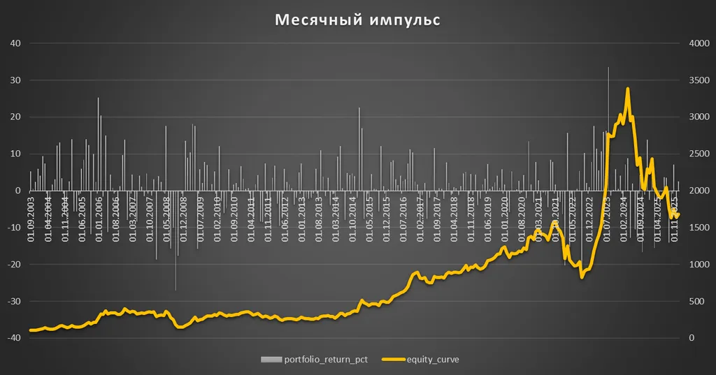 Для месячного momentum получается рост портфеля почти в 16 раз (правда здесь данные с августа 2003 года), при этом месячное стандартное отклонение составляет около 8%. Среднемесячный темп роста 6%.