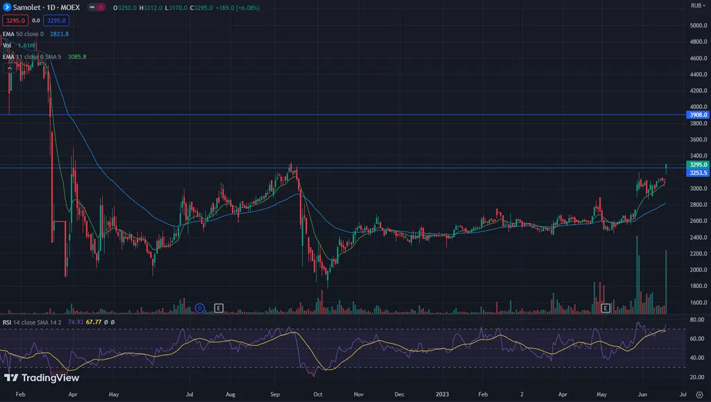 Закрытие выше предыдущих максимумов. Увеличение объема при прохождении вверх уровней сопротивления.
