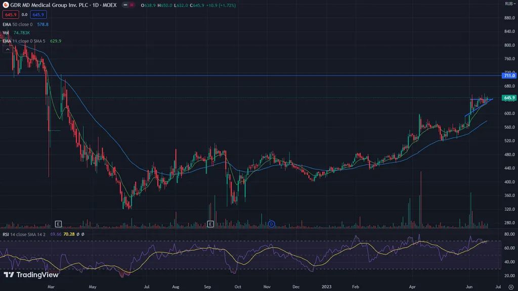 Перед нами еще один классический паттерн - восходящий треугольник. Происходит попытка прорыва вверх данной фигуры. Целью движения может выступить следующий уровень сопротивления на уровне 711 рублей за депозитарную расписку. Стоп-лосс стоит установить ниже уровня "гипотенузы", снижение цены в данную область будет свидетельствовать о ложном пробое.