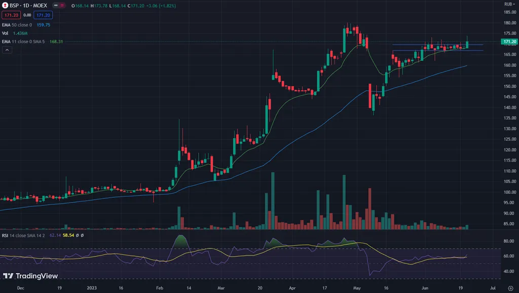 Очередная классика - горизонтальная консолидация. Попытка пробоя вверх на возросшем объеме торгов относительно предыдущих дней. Вероятно движение к историческим максимумам с потенциалом достижения круглого числа = 200. Стоп-лосс разумно установить на событие, которое будет заключаться в закрытии торгового дня ниже пробитого верхнего уровня горизонтальной консолидации. Это будет означать ложный пробой и возврат в предыдущий торговый диапазон.