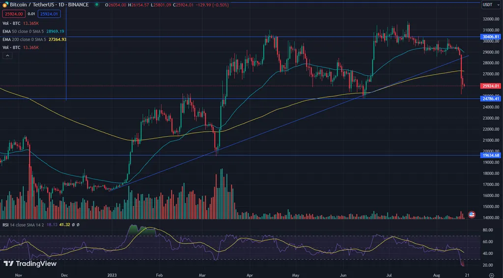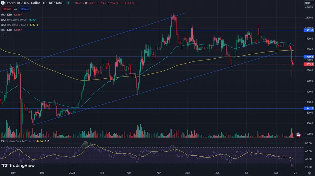 Как видно на графиках, был пробит вниз растущий тренд, который берет начало в январе 2023 года. Потенциально котировки могут уйти на предыдущие минимумы в район 16 000 для Биткоина и 1 100 для Эфира.