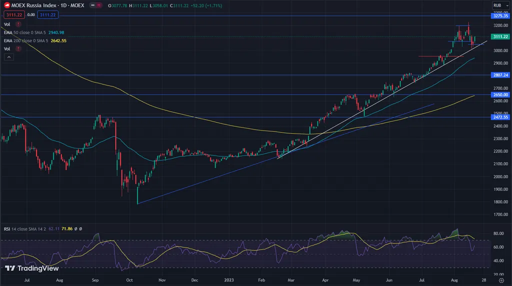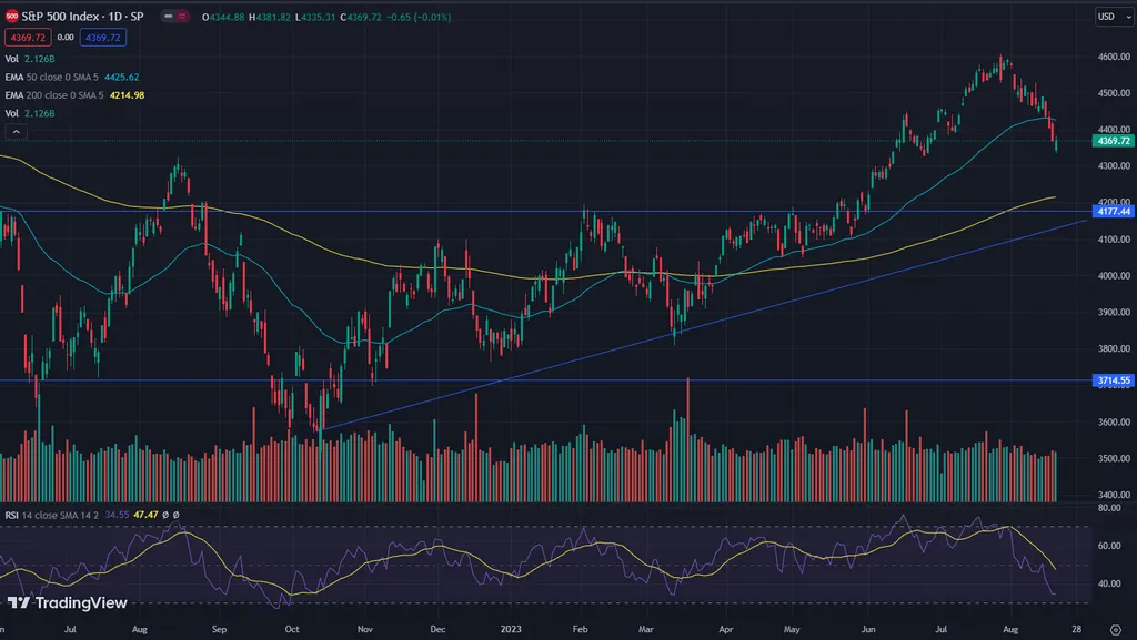 Коррекция на американском рынке привела значение индекса на уровень 100-дневной скользящей средней. Дальнейшее развитие движения может дойти до 200-дневной скользящей средней в район 4 200 пунктов, где также проходит поддержка растущей тенденции с октября 2022 года. Там вероятна проверка на прочность данного тренда.