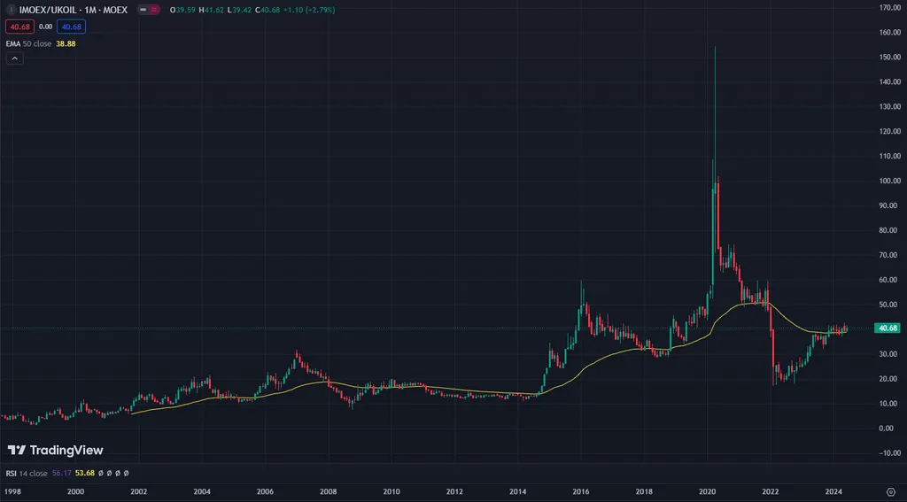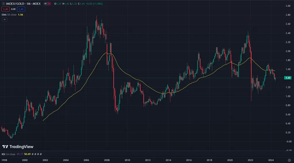 Индекс Мосбиржи, выраженный в котировках нефти Brent и в золоте (графики месячные), намекает нам об отсутствии относительной перекупленности.