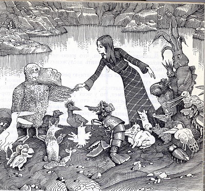 Я и стал делать рисунки, от одного к другому находя решения, подходящие именно ддя данного рисунка, — не руководясь единой схемой, целевой (а с самого начала была у меня такая схема: Гулливер — норма, а все остальное аномалии. Мы от нее отказались, как от недалекого решения), полностью исключив просто развлекательность рисунка — каждый должен был иметь смысловой стержень.