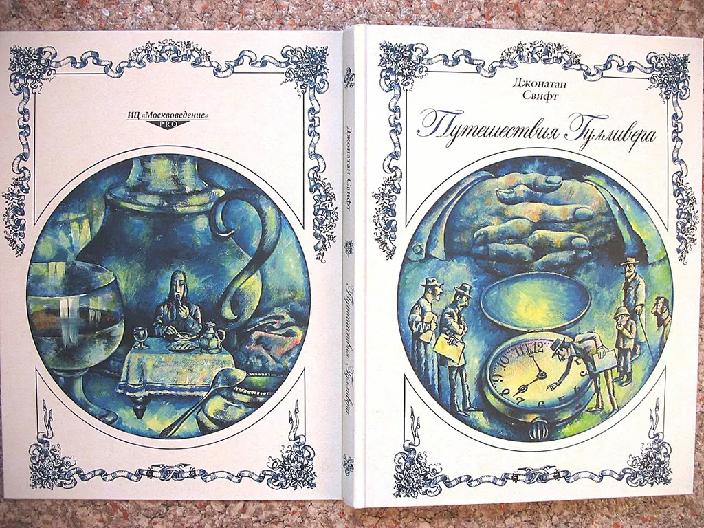 Книга была цветная. Это первая моя цветная книга. Рисунки к Свифту нельзя написать, их надо лепить цветом. Поскольку книга эта — не книга-состояние, а книга-форма. Макет я пробовал решить как непрерывный, где рисунки связаны не текстом, а напрямую друг с другом, как ручеек, от начала до конца. Получилось это, по-моему, слабо — этот ручеек.