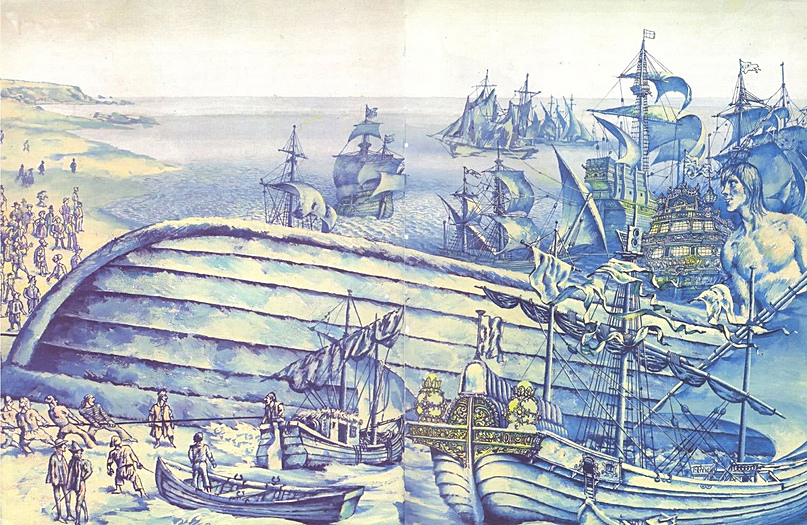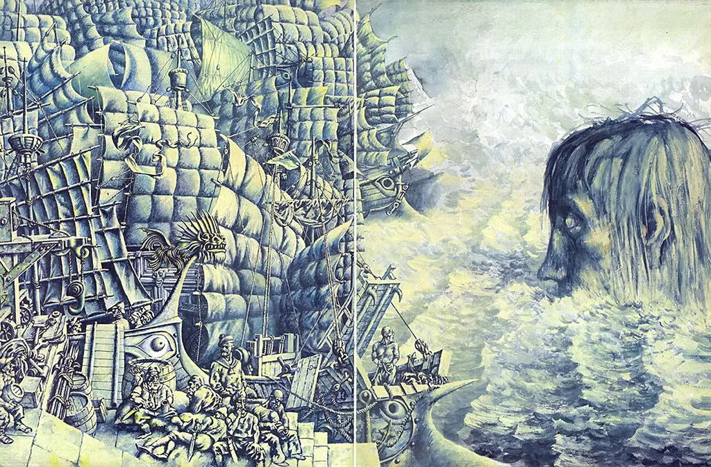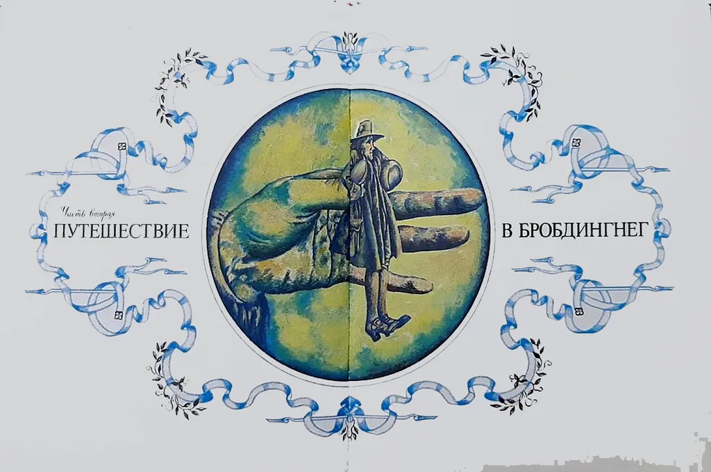 А Человек-Гора на следующем развороте — крохотный, в крохотной лодочке, среди огромного пространства, где нет уже ни великанов, ни лилипутов, «и время, вперед — мужайся, старое сердце…»