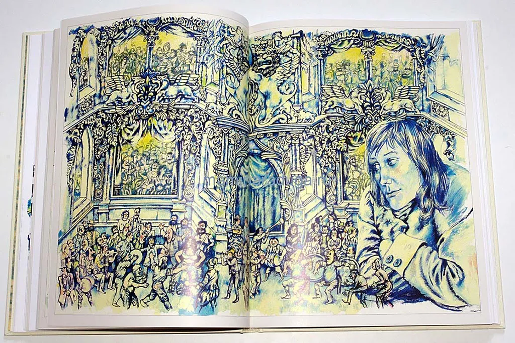 Я решил использовать в работе чуть деформированное пространство и трехмерный шрифт в трехмерном построении. Такой шрифт я делал впервые еще лет десять назад в книге «Алиса в Стране чудес». Для такой лукавой книги подобное прихотливое и лукавое построение вполне уместно. Мне, правда, говорили, что такая усложненность непосильна детскому глазу. Это неправильно. Дети в массе любознательны и обожают разгадывать ребусы. И судя по письмам, приходящим в издательство, рисунки дети в общем приняли. Приятно.