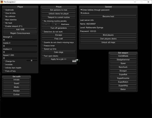 - Set outfit = установить костюм: Inmate = заключенный, Guard = надзиратель, Medic = медик, Warden = усиленный надзиратель, Civilian = мирный житель.