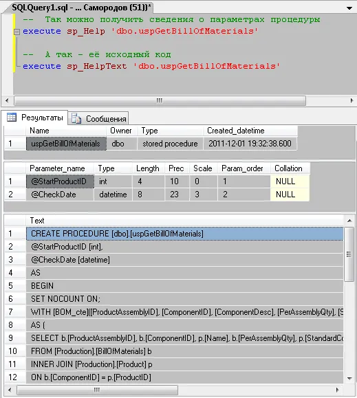 Для исследования объектов базы данных (в стиле обратного инжиниринга) в SQL Server’е имеются штатные средства. А именно две полезных хранимых процедуры: sp_Help и sp_HelpText. Пользоваться ими очень просто, посмотрите на пример: