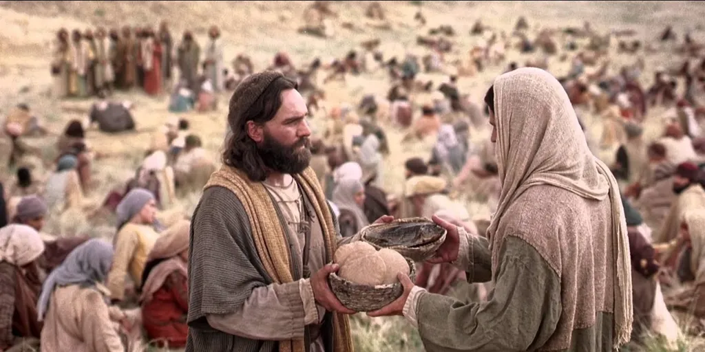 "Когда же настал вечер, приступили к Нему ученики Его и сказали: «Место здесь пустынное, и время уже позднее; отпусти народ, чтобы они пошли в селения и купили себе пищи». Но Иисус сказал им: «Не нужно им идти, вы дайте им есть». Они же говорят Ему: «У нас здесь только пять хлебов и две рыбы». Он сказал: «Принесите их Мне сюда». И велел народу возлечь на траву, и, взяв пять хлебов и две рыбы, воззрел на небо, благословил и, преломив, дал хлебы ученикам, а ученики — народу. И ели все, и насытились; и набрали оставшихся кусков двенадцать коробов полных; а евших было около пяти тысяч человек, кроме женщин и детей" (Мф. 14:15-21).