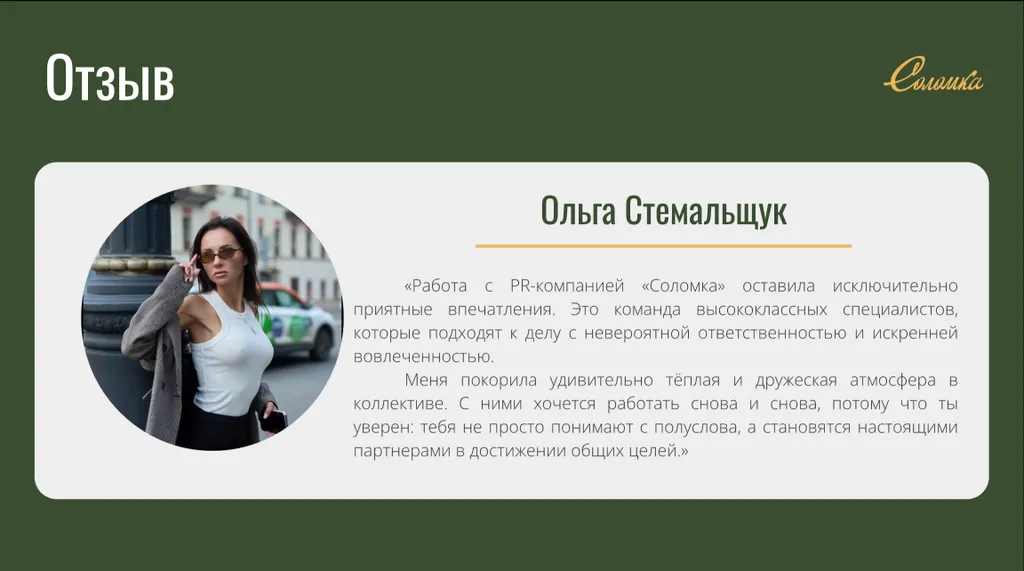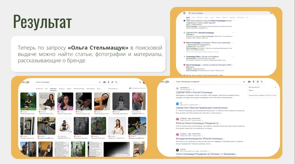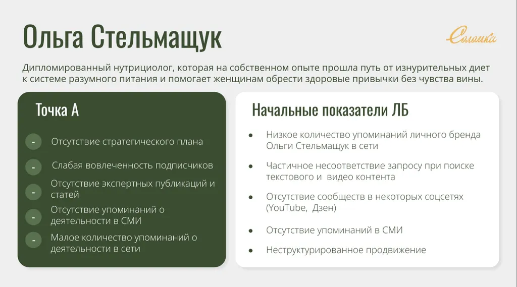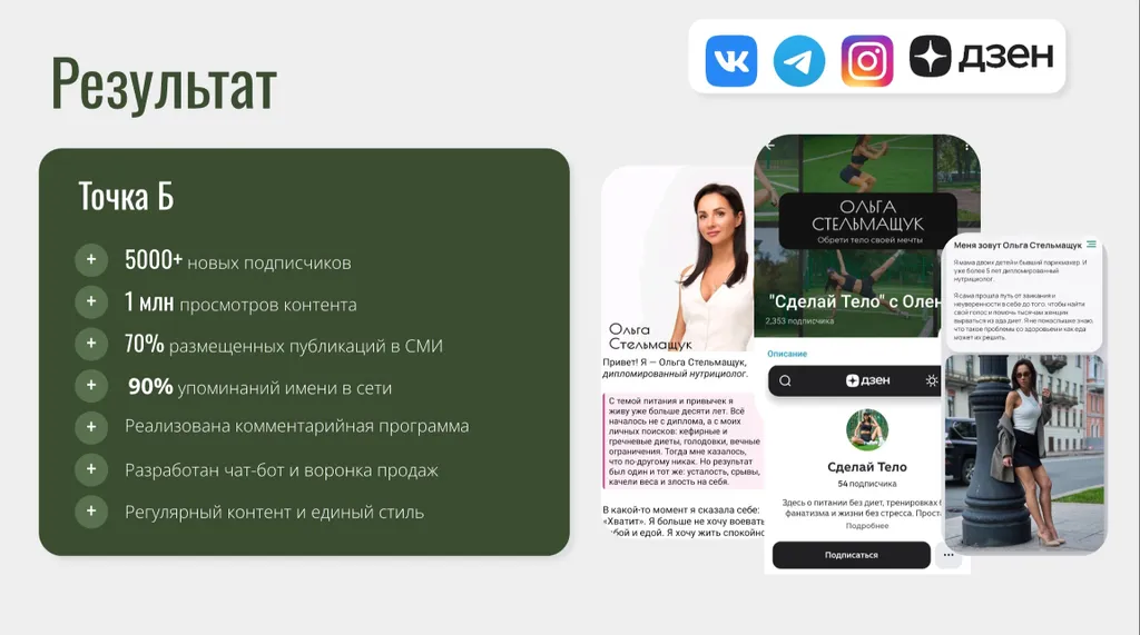 Кейс Ольги Стельмащук наглядно демонстрирует, что успешный личный бренд в персональной нише строится не на случайных активностях, а на продуманной системе, где стратегия, упаковка, медиакоммуникации и коммерция синхронизированы для достижения одной цели — трансформации личного опыта эксперта в ценный, узнаваемый и прибыльный актив.
