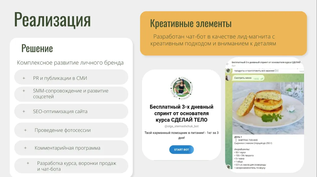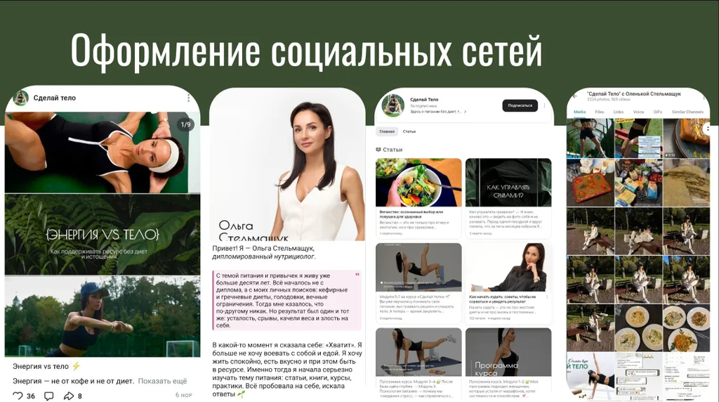Клиент: Ольга Стельмащук — дипломированный нутрициолог, автор системы питания «Сделай тело». На собственном опыте прошла путь от изнурительных диет к осознанному питанию и помогает женщинам обрести здоровые привычки без чувства вины