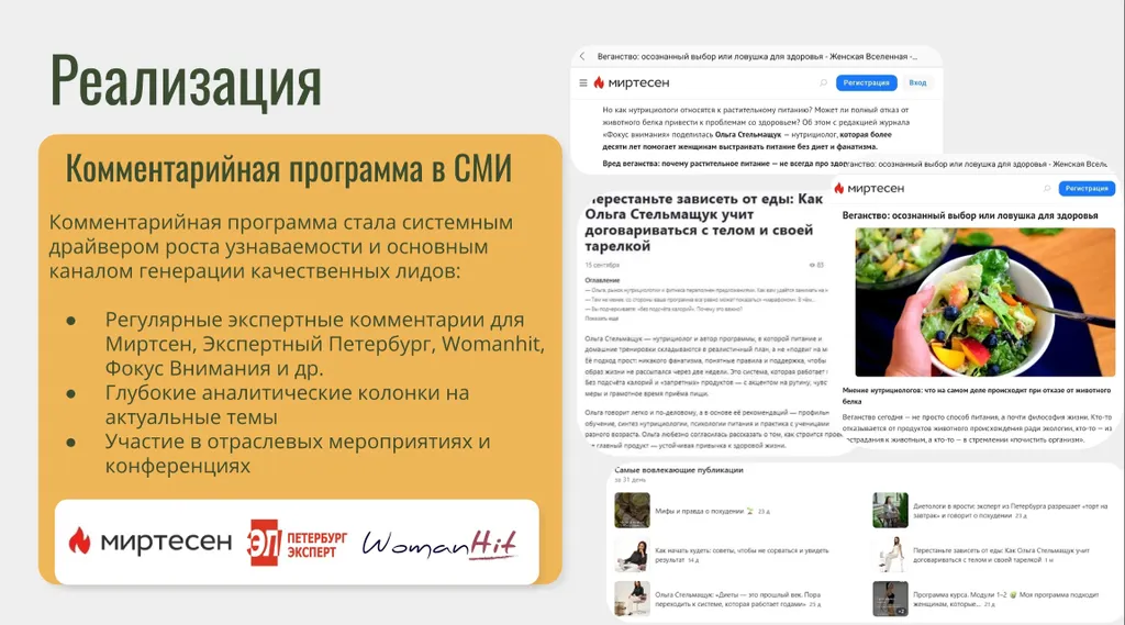 - Расширение медиаприсутствия через публикации в СМИ и экспертные комментарии.