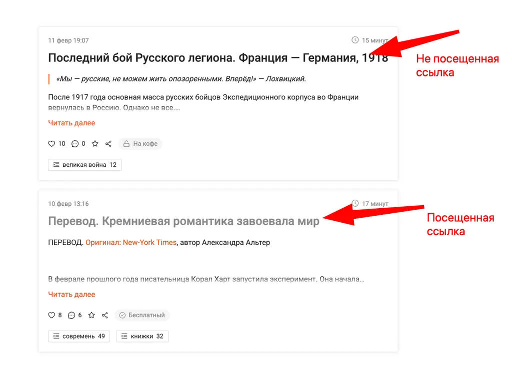 В списке постов в ленте те посты, которые вы уже посещали, меняют цвет заголовка. Раньше это работало только в одном браузере. А теперь работает на всех ваших устройствах. Прочли пост на телефоне — на компьютере он тоже будет помечен как прочтенный, если вы залогинены под тем же аккаунтом.