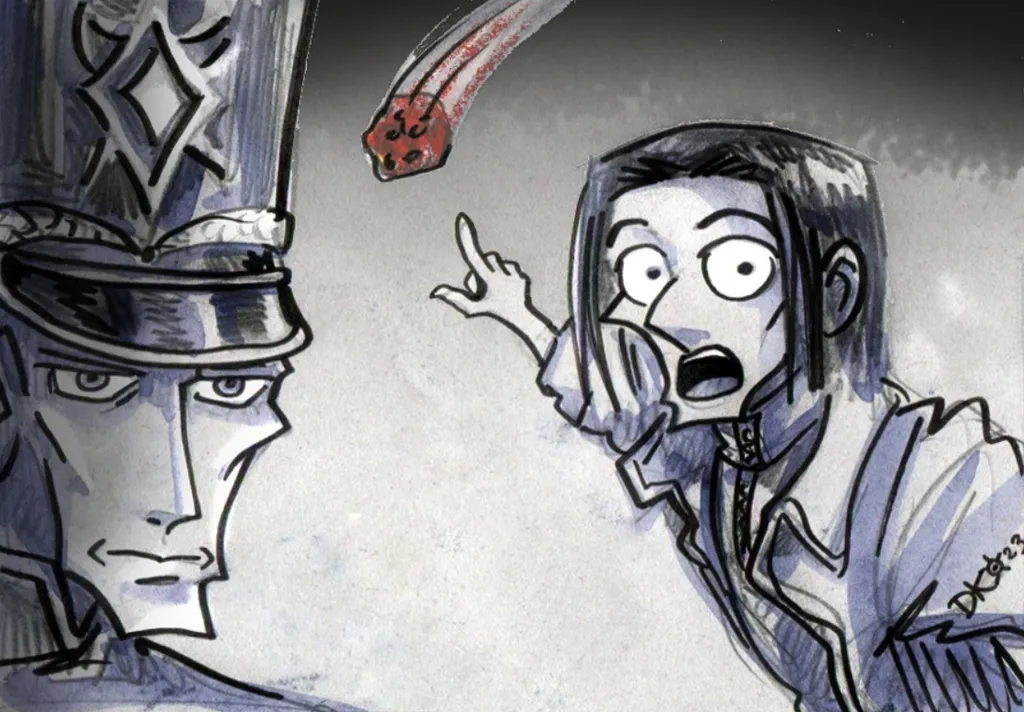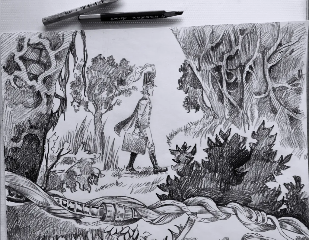 По лору персонажа/мира идей не было, и я начала свою любимую рубрику в создании историй — «вопрос-ответ», что обычно очень помогает. Кто он такой и что делает? Судя по красивой форме, он занимает какую-то должность (ибо слишком представительно для повседневной одежды). Значит, его профессия связана с чем-то важным. И так далее. В серии артов этот, пока что безымянный персонаж, просто шатался по всяким локациям, созерцал развалины и пустоши, валялся на траве (какая интересная профессия, тоже так хочу). Какое есть обоснование его странствий? Для меня — странствия персонажа были рефлексией и абстрагированием от событий, начатых в феврале 22го. Но делать из него простого путешественника мне не хотелось. Ему нужна серьёзная цель, мотивация. Хотелось в том числе какой-то глобальности и влияния на мир.