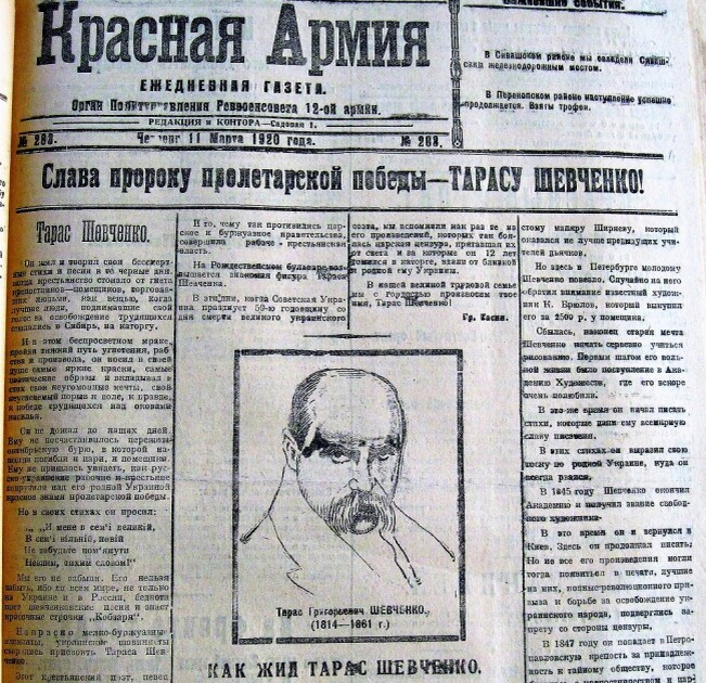 С не меньшим размахом праздновали и в следующем году. Газета «Красная Армия» вышла с передовой статье «Слава пророку пролетарской победы — Тарасу Шевченко!». В ней было написано: «Напрасно мелко-буржуазные элементы, украинские шовинисты пытались присвоить Тараса Шевченко. Этот крестьянский поэт, певец пролетарской свободы, никогда не был с ними душой. Он наш рабоче-крестьянский трубадур, сзывавший весь трудовой народ на борьбу с классовым врагом, с помещиками и эксплуататорами». Тарас Григорьевич тогда тоже перевернулся в гробу, так как его объявили большевиком. Это сделал на многотысячном праздничном митинге в Киеве народный комиссар просвещения УССР Владимир Затонский: «В пятьдесят девятую годовщину смерти поэта бедноты Советская власть закладывает ему памятник. Мы уважаем Тараса как нашего предшественника, как настоящего украинского большевика».